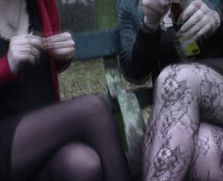 4 - In this scene, we see the two girls who seem to be dressed very seductivly even though we can see its a cold day as all the characters are dressed warmly. This develops the forms and conventions of real media products as in most videos the girls are 'sexed out' as they are wearing clothes which show off the skin. We wanted to play around with this idea of branding girls as sluts and tried to add humour to it as we found that they don't actually fit within the conventions of the music video as it is all about lonelyness and isolation however their image shows happyness and 'freedom' in a way. However the hidden message behind these characters are that they are not actually free, they are conforming to their apparent given image of being sluts which has been developed overtime within society. This means they must please the man by showing off their skin and acting in a flirtacious way.